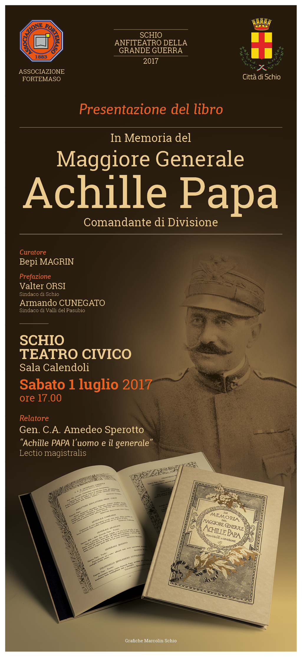Un intero pomeriggio dedicato al Generale delle 52 Gallerie. E non poteva che essere così, nel centenario della loro costruzione. Domani dalle ore 17, infatti, si terrà al Teatro Civico di Schio un evento commemorativo sul Generale Achille Papa dal titolo “Achille Papa, l’uomo e il Generale”, a cura dell’Associazione culturale ForteMaso. Il Generale Amedeo Sperotto terrà una lectio magistralis sulla figura umana e militare del generale Papa, dopodiché verrà presentata la riedizione anastatica in copie numerate di un introvabile volume – messo a disposizione da Bepi Magrin, alpinista e scrittore di Valdagno – di memorie del Generale Papa, di cui la ForteMaso ha fatto riprodurre la copia che era in possesso della moglie di Papa. Infine, Carlo Bettanin, conoscitore profondo dell’opera ingegneristica militare delle 52 Gallerie del Pasubio, parlerà dell’anello di manovra messo in atto tra Bocchetta Campiglia e Malga Fieno. Durante l’evento verrà messo a disposizione del pubblico il 3° Annullo della serie “Schio anfiteatro della Grande Guerra”. L’ingresso è gratuito.