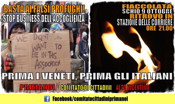 Fiaccolate per l’accoglienza, fiaccolate contro l’arrivo dei profughi. Il Vicentino è diventato un campo di battaglia ideologico ed in particolare l’Alto Vicentino. Il comitato spontaneo di cittadini PrimaNoi ha promosso per venerdì sera una fiaccolata per “sottolineare il disastro nella gestione dei profughi e sedicenti tali e nel contempo il relativo business dell’accoglienza”. “Sarà una fiaccolata per dire basta all’accoglienza -recita un comunicato- senza se e senza ma e per ribadire la contrarietà alle politiche governative che impongono al territorio l’arrivo di questi soggetti che, come dimostrano i numeri ufficiali, non si possono definire profughi ma immigrati clandestini a tutti gli effetti. Vogliamo proporre una manifestazione che unisca i cittadini dell’alto vicentino al di là delle appartenenze politiche attraverso i vari comitati spontanei sorti nel territorio provinciale e regionale in queste settimane, aprendo quindi a tutti coloro che come noi ritengono necessario dare dei segnali forti e incisivi verso una classe politica indegna e contro quel peloso buonismo confuso troppo spesso con la carità.