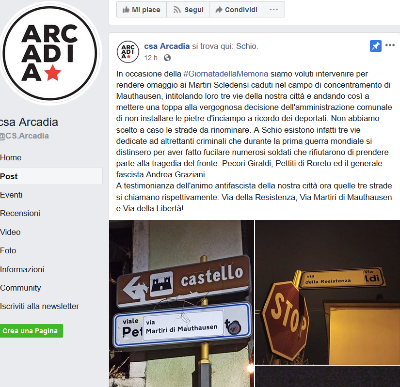 In occasione della #GiornatadellaMemoria gli attivisti del Centro Sociale Arcadia di Schio sono intervenire per rendere omaggio ai Martiri Scledensi caduti nel campo di concentramento di Mauthausen, intitolando loro tre vie della città: “Abbiamo voluto così a mettere una toppa alla vergognosa decisione dell’amministrazione comunale di non installare le pietre d’inciampo a ricordo dei deportati – si legge in un comunicato del centro sociale – non abbiamo scelto a caso le strade da rinominare. A Schio esistono infatti tre vie dedicate ad altrettanti criminali che durante la prima guerra mondiale si distinsero per aver fatto fucilare numerosi soldati che rifiutarono di prendere parte alla tragedia del fronte: Pecori Giraldi, Pettiti di Roreto ed il generale fascista Andrea Graziani. A testimonianza dell’animo antifascista della nostra città ora quelle tre strade si chiamano rispettivamente: Via della Resistenza, Via Martiri di Mauthausen e Via della Libertà”.
