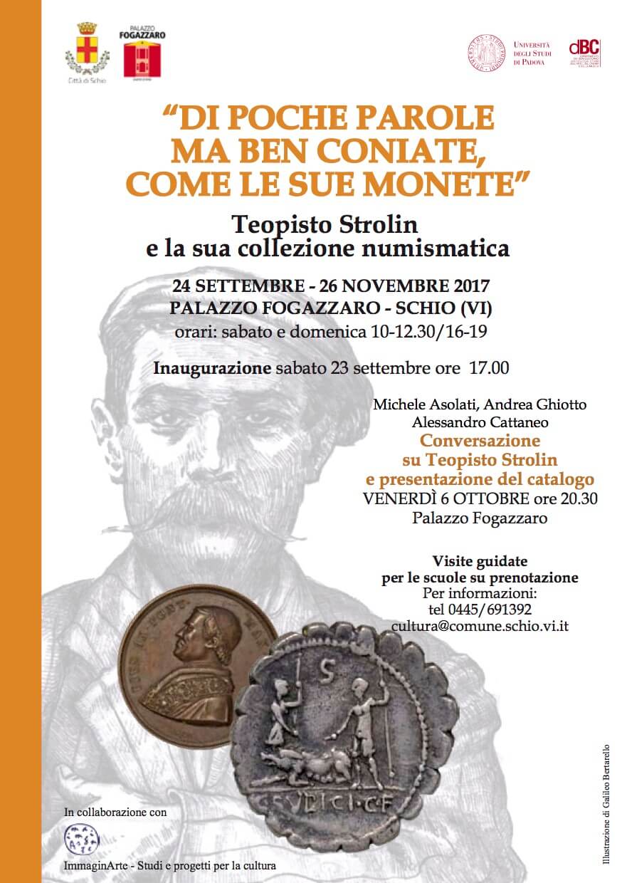È stata inaugurata sabato a Palazzo Fogazzaro la mostra “Di poche parole ma ben coniate, come le sue monete”. Teopisto Strolin e la sua collezione numismatica. Lo scledense Strolin (1868-1951) custode del Civico Macello di Schio, è stato al contempo grande intenditore d’arte, esperto di storia e appassionato collezionista numismatico. La sua vasta collezione, che conta quasi 3500 tra monete e medaglie, è stata donata nel 2014 al Comune e viene per la prima volta esposta al pubblico. Dagli imperatori romani ai romani pontefici, dai dogi veneziani ai sovrani bizantini, la storia, la geografia, le genealogie imperiali, i giubilei, le guerre e le paci si dispiegano davanti agli occhi, nel racconto che di essi ci tracciano le monete. Sono possibili visite guidate per le scuole, su prenotazione. Inoltre, il 6 ottobre prossimo, alle 20.30 presso Palazzo Fogazzaro, sarà presentato il catalogo della mostra durante una conversazione su Teopisto Strolin a cura di Michele Asolati, Andrea Raffaele Ghiotto e Alessandro Cattaneo. La mostra resterà aperta fino al 26 novembre 2017 con i seguenti orari: sabato e domenica 10.00-12.30 e 16.00-19.00