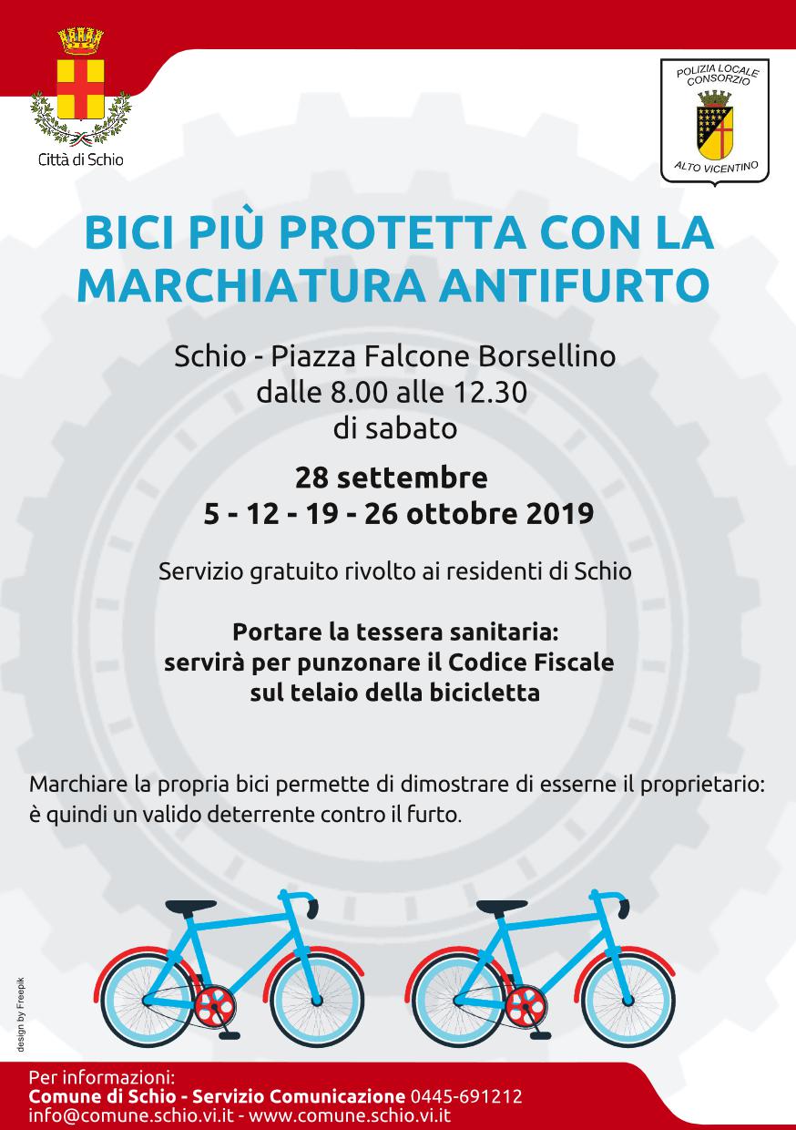 Dopo il successo dei primi appuntamenti, anche per quest’autunno Comune di Schio e Consorzio di Polizia Locale Alto Vicentino organizzano una campagna di marchiatura delle biciclette, i sabati 28 settembre e 5 – 12 – 19 – 26 ottobre, dalle 8.00 alle 12.30, in Piazza Falcone Borsellino.