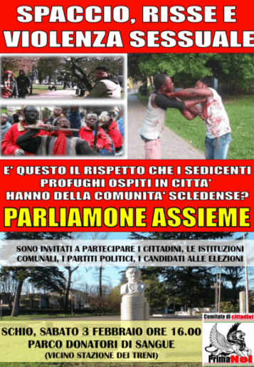 Negli ultimi mesi i richiedenti asilo presenti in città e nei dintorni di Schio sono saliti alla ribalta della cronaca nera. Prima Noi organizza un’assemblea in città sabato pomeriggio per discutere della questione. “Tra spaccio di droga, risse con accoltellamenti in pieno centro storico, come un fulmine a ciel sereno è arrivata nei giorni scorsi la notizia di un altro spiacevole e odioso fatto di cronaca – dice il gruppo politico in un comunicato stampa – un tentativo di stupro ad una giovane di 18 anni mentre rientrava a casa propria. Il responsabile è un richiedente asilo Liberiano che ha ammesso le sue responsabilità ed è stato denunciato a piede libero per violenza sessuale. L’assemblea promossa per sabato pomeriggio al parco Donatori di Sangue alle 16, non è un esercizio di retorica per soddisfare pruriti esibizionistici ma una necessità organica per aprire una discussione sulla gestione degli immigrati che si trovano in città. La domanda che poi molti cittadini si pongono è tanto banale quanto legittima: chi garantisce la nostra sicurezza?. Per quanto ci riguarda, Schio, come le altre città d’Italia, non può più essere ostaggio di persone che millantano status fasulli godendo perciò di privilegi che a nessun giovane italiano viene concesso. Non puntiamo il dito contro tutti i “migranti”, ma essendo (quasi) tutti dei falsi profughi, dobbiamo fargli capire in modo inequivocabile che sono ospiti sgraditi e che la soluzione migliore per loro è di fare fagotto per tornare il prima possibile dall’altra parte del mediterraneo. La cittadinanza, i partiti politici, le istituzioni comunali, i candidati alle elezioni politiche sono invitati a partecipare”.