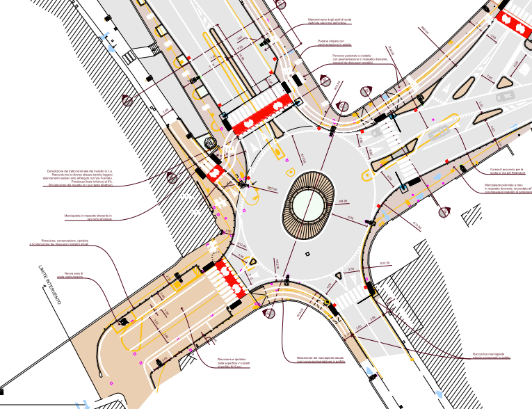 La nuova rotatoria avrà una forma leggermente allungata e sarà costituita da un’unica corsia centrale larga 8.50 m, con banchina laterale di 50 cm fino al bordo delle aree pedonali o ciclabili (sia cordoli rialzati che dissuasori a superficie di raso).