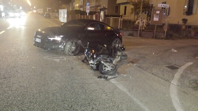 Il veicolo autovettura Audi TT condotta da un 27enne residente a Schio proveniente, da via Gen. A. Papa s’immetteva in via Rovereto con direzione di marcia via Pietro Maraschin omettendo di cedere la precedenza al veicolo motociclo Italjet condotto da un 34enne residente a Schio, che proveniente da via Pietro Maraschin transitante in via Rovereto con direzione di marcia via Lungo Gogna. Quest’ultimo, nel tentativo di evitare la collisione, frenava ma vanamente poiché in scivolata andava ad impattare con la parte anteriore del motociclo contro lo spigolo anteriore laterale Sx dell’auto Audi. A seguito dello scontro frontale laterale dei veicoli, il conducente del motociclo rovinava a terra procurandosi lesioni fortunosamente di lieve entità. Il ferito veniva immobilizzato dal personale medico intervenuto e trasportato con ambulanza al Pronto Soccorso di Santorso.