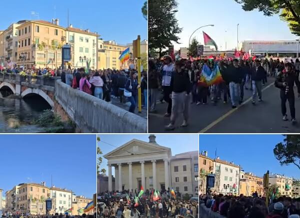 Anche a Padova la mobilitazione ha registrato numeri importanti. Migliaia di persone sono partite da piazza Garibaldi, muovendosi verso la zona del Portello tra cori e musica. La rotonda della Stanga è stata temporaneamente bloccata. Non sono mancati momenti di tensione: già nella serata di ieri, circa mille giovani dei centri sociali avevano manifestato davanti alla questura accendendo fumogeni e scandendo slogan contro la polizia. Questa mattina si sono aggiunti cortei studenteschi con occupazioni simboliche negli istituti e assemblee universitarie, mentre centinaia di attivisti hanno provato a bloccare l’Interporto.