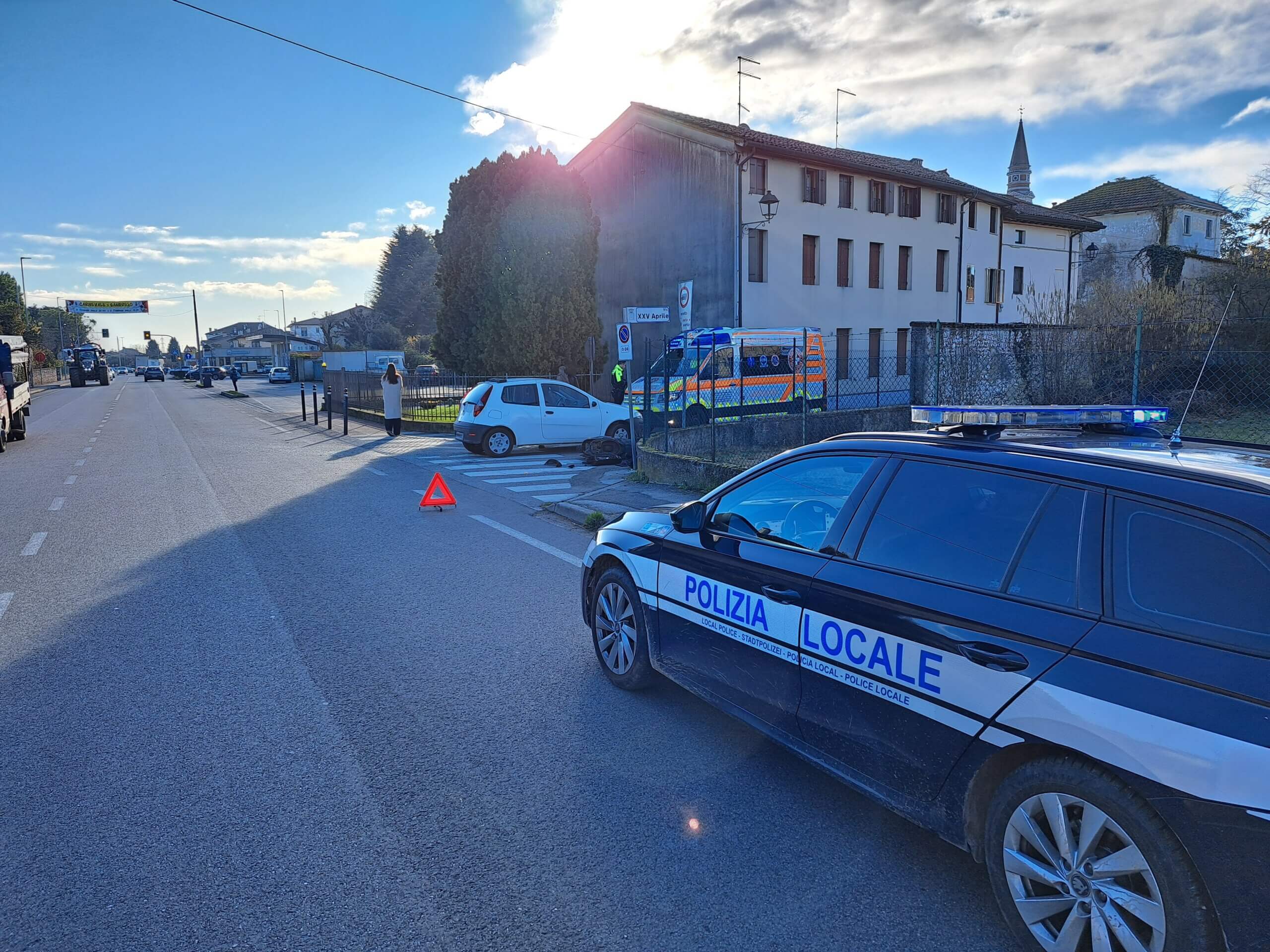 Incidente stamattina alle ore 08:35 a Sandrigo in via Monte Grappa all’incrocio con via XXV Aprile: una Fiat Punto guidata da una 61enne del luogo si è scontrata con una moto Piaggio condotta dal 17enne D.P. di Bressanvido. A seguito dello scontro, il motociclista ha avuto la peggio. Sul posto è intervenuta un’ambulanza del SUEM 118 che prestava le prime cure al ciclomotorista per accompagnarlo poi in codice giallo presso il pronto soccorso dell’ospedale di Vicenza. Rilievi tecnici del sinistro stradale e regolazione del traffico a cura della pattuglia di pronto intervento della Polizia Locale Nordest Vicentino.