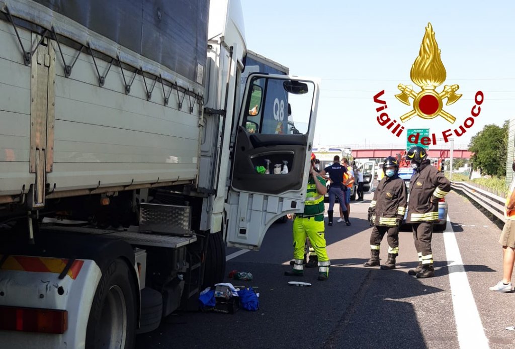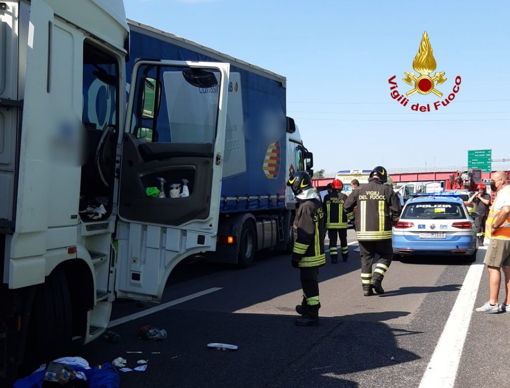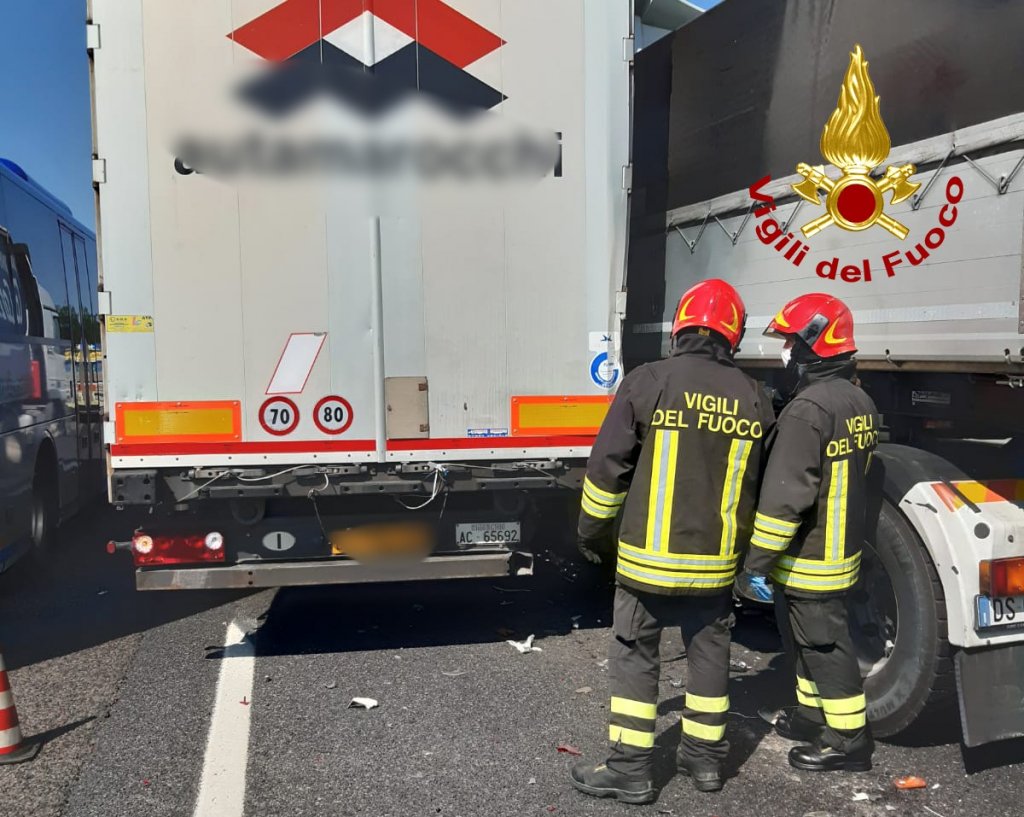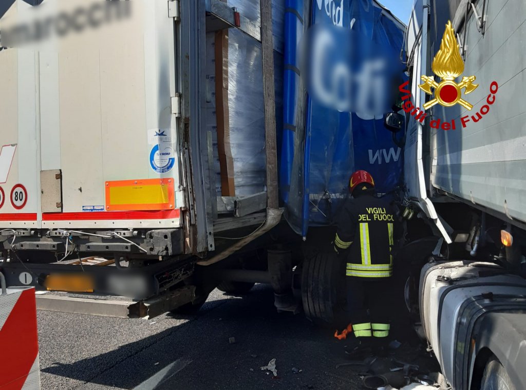 Scontro fra tre camion in A4: autista rimane incastrato