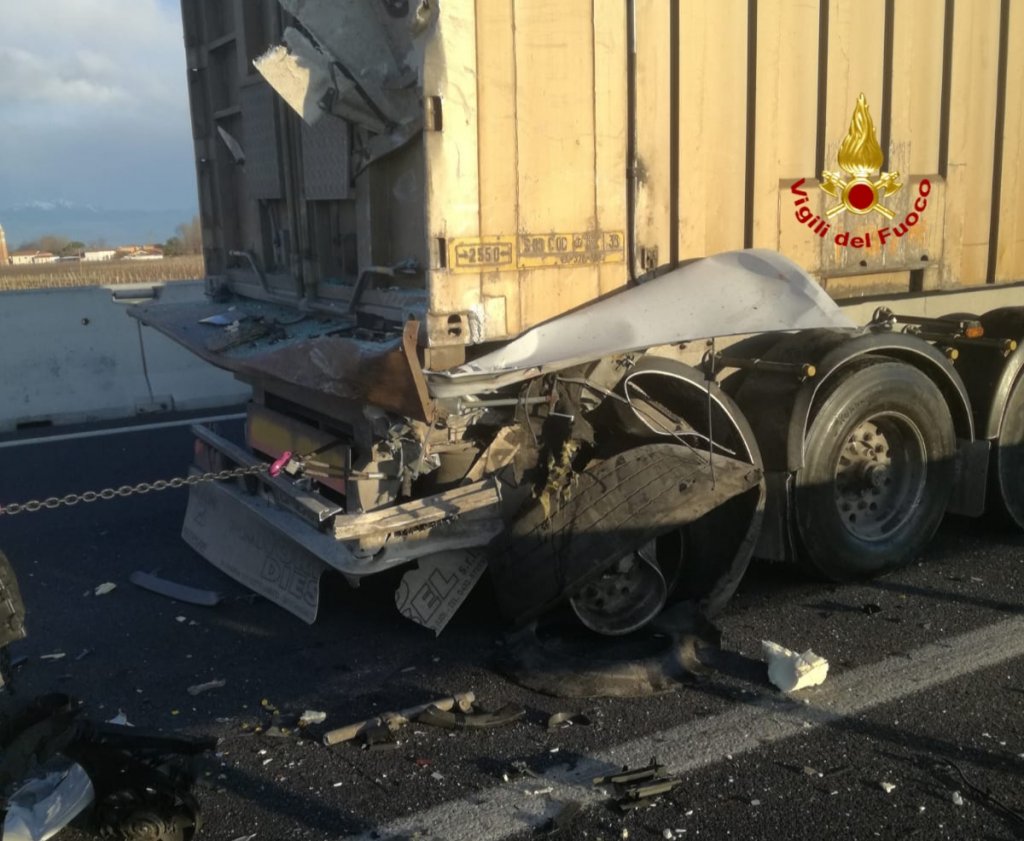 Questa mattina, poco dopo le 7:30, i vigili del fuoco sono intervenuti in autostrada A4 al km 446 e 880, poco dopo l’uscita di San Stino in direzione Trieste per un tamponamento tra un piccolo veicolo commerciale frigo e un autoarticolato: l’autista del mezzo più leggero è morto. Si tratta di Luca Fochesato, 38enne residente a Loria (Treviso), dipendente del Salumificio Fratelli Scapochin di Padova, ma nativo di Montecchio Maggiore. L’uomo viveva dal 2012 a Loria, trasferitosi dal Comune di Castello di Godego, sempre nel Trevigiano. I vigili del fuoco arrivati da Portogruaro e Motta di Livenza, hanno messo in sicurezza i mezzi ed estratto dalla cabina il corpo senza vita dell’autista come accertato dal personale medico del SUEM. Sul posto la polstrada e il personale ausiliario di autostrada. Durante le operazioni di soccorso il traffico è rimasto bloccato.