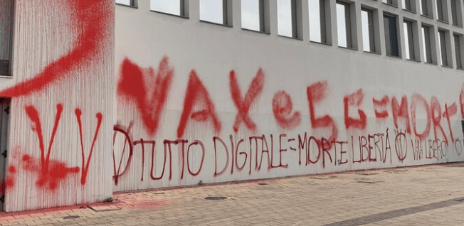 Scritte no-vax con vernice rossa sono comparse stamani sui muri della sede di Smact Competence Center, contigua alla Fiera di Padova.