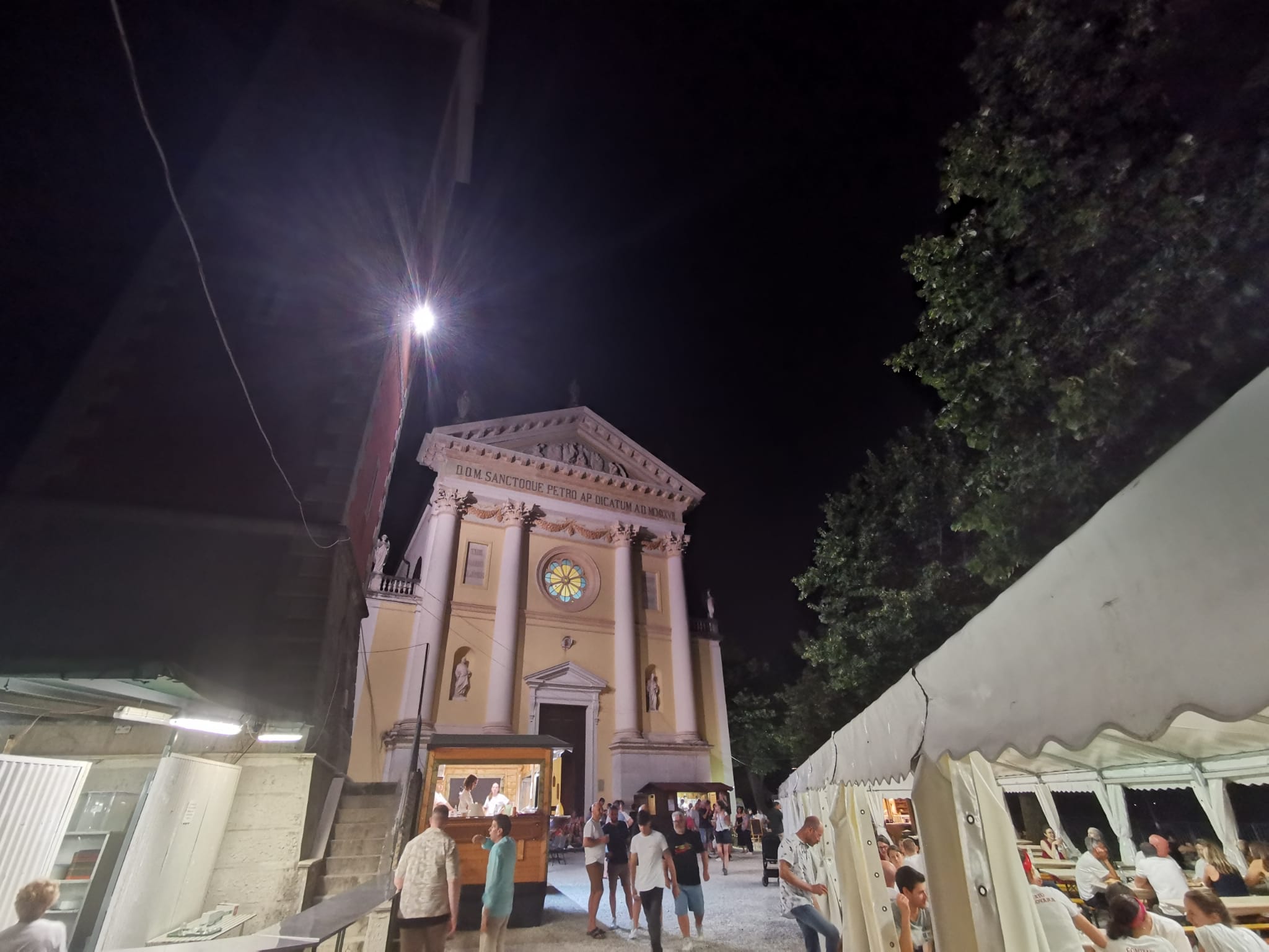 La festa si svolge in uno spazio splendido e accogliente, proprio davanti alla bellissima chiesa di San Pietro Apostolo, con le porte spalancate sulla festa e sulla comunità. Un’immagine che da sola vale il viaggio: la spiritualità che incontra la convivialità, in un clima di sincera condivisione.