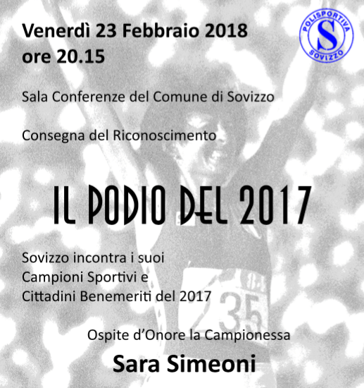 Gli assessorati alla Cultura e allo Sport del Comune di Sovizzo, in collaborazione con la Polisportiva di Sovizzo, invitano alla manifestazione “Il Podio 2017”. L’evento è in program venerì 23 febbraio alle ore 20.15 presso la Sala Conferenze del Municipio Sovizzo incontra i campioni sportivi e i cittadini benemeriti che si sono distinti nel corso del 2017, che verranno insigniti del riconoscimento “Il Podio 2017”, nel corso di una serata che vedrà la presenza come ospite d’onore della campionessa olimpionica a Mosca ‘80 ed ex primatista del Mondo Sara Simeoni, eletta “Atleta del Centenario” dal CONI in occasione dei festeggiamenti per il centenario del Comitato Olimpico italiano. Ingresso libero.