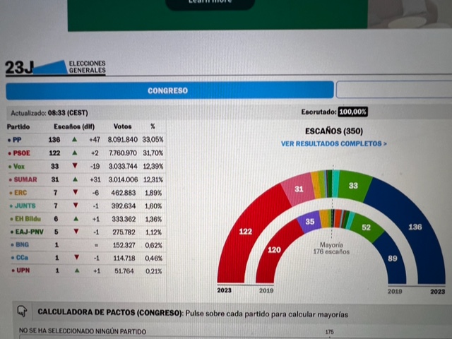 In poche parole i socialisti di Sanchez hanno tenuto oltre ogni previsione (122 seggi, due in più del 2019) ed il Partito Popolare pur vincendo (e passando dagli 89 seggi del 2019 ai 136 di ieri) non è in grado di esprimere la maggioranza richiesta per governare (176 seggi).