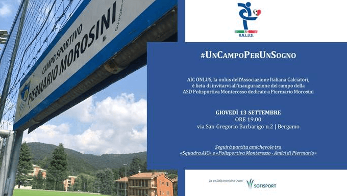 Sarà inaugurato domani giovedì 13 settembre prossimo, alle ore 19,00 a Bergamo, presso la sede della ASD Polisportiva Monterosso, il nuovo campo dedicato a Piermario Morosini, realizzato da AIC ONLUS (la Onlus dell’Associazione Italiana Calciatori) grazie ai fondi raccolti in questi anni dai calciatori di tutte le categorie finalizzati alla realizzazione del progetto in ricordo del calciatore scomparso nell’aprile del 2012. Saranno presenti, al campo sul quale Piermario è cresciuto calcisticamente, tanti suoi amici calciatori che da tempo portano avanti l’impegno di non dimenticarlo: Michael Agazzi, che ha promosso l’iniziativa, Giampaolo Bellini, Cristian Raimondi, Damiano Tommasi, Diego Bonavina, Massimo Paganin e molti altri amici ed ex-compagni di squadra. Alle 20.00, al termine della presentazione, si disputerà una partita amichevole tra la “Squadra AIC” e la squadra “Polisportiva Monterosso – Amici di Piermario”.
