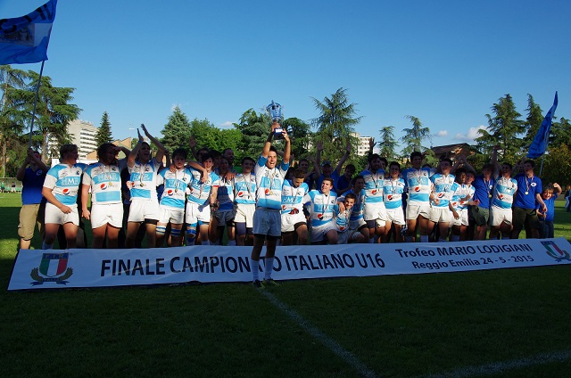 Il secondo scudetto è giunto domenica, questa volta per merito dell’Under 16 maschile, che dopo cinque anni ha riportato ad Altichiero il titolo nazionale di categoria, battendo sul campo neutro di Reggio Emilia il Rugby Livorno, con un perentorio 28 a 7. Gli juniores sono approdati in finale grazie un bilancio di 21 vittorie e una sola sconfitta di misura, 176 mete e 1074 punti all’attivo, e solo 111 punti subiti in match ufficiali. In questa squadra la pattuglia dei vicentini è rappresentata da ben quattro atleti e un allenatore, tutti protagonisti del gruppo che prima ha vinto il campionato Elite del Triveneto (Trofeo della Serenissima) e poi il titolo italiano Under 16. Sono il mediano di mischia Jacopo Rossato, il flanker Edamo Mattiello, l’ala/centro Jacopo Trulla, tutti e tre di Vicenza, più il tallonatore bassanese Filippo Andriollo e l’head coach della squadra Francesco Bianchi, vicentino doc e anche tecnico del Centro di Formazione federale Under 16 della provincia di Padova.