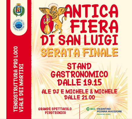Stasera è l’ultimo giorno per la tradizionale Sagra di San Luigi a Noventa Vicentina. Luna park, stand gastronomico e pista da ballo in sede pro loco in via dei Martiri, Pesca di beneficenza. “E per concludere – spiega il sindaco Mattia Veronese – uno spettacolare momento conclusivo: con il tradizionale spettacolo pirotecnico a partire dalle ore 23.30. Vi aspettiamo!”.