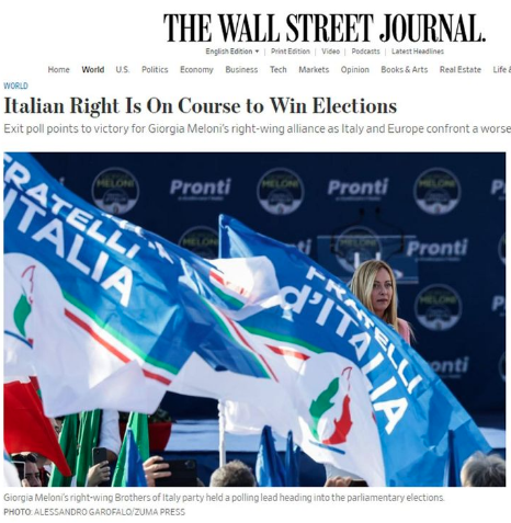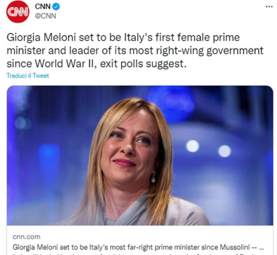 La maggior parte dei titoli sulla stampa estera dedicati alla vittoria di Meloni sottolinea come sarà il primo governo italiano con una premier donna in Italia, ma anche il più spostato a destra dalla caduta di Mussolini e dalla fine della Seconda Guerra Mondiale. Per il Washington Post “l’Italia potrebbe avere il primo governo di estrema destra dopo Mussolini”.