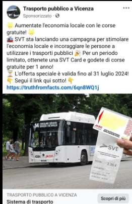 SVT segnala la diffusione sui social media di una nuova comunicazione fraudolenta, da parte dell’account già segnalato denominato “Trasporto pubblico a Vicenza”, che offre la possibilità di ottenere gratuitamente una tessera SVT.