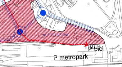 – La rampa discesa al parcheggio interrato, che consente la connessione diretta tra mezzo di traposto privato su gomma e servizi di trasporto ferroviario attraverso il nuovo terminal AV/AC. La planimetria dell’area di scambio intermodale e riportata nell’immagine seguente: