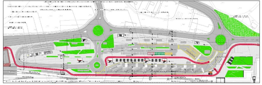 – Capolinea del servizio di trasporto pubblico di massa, con stalli di sosta disposti a spina di pesce, ad accesso riservato che consentono di accogliere gli autobus snodati da 18 m preposti al servizio urbano ed extraurbano;