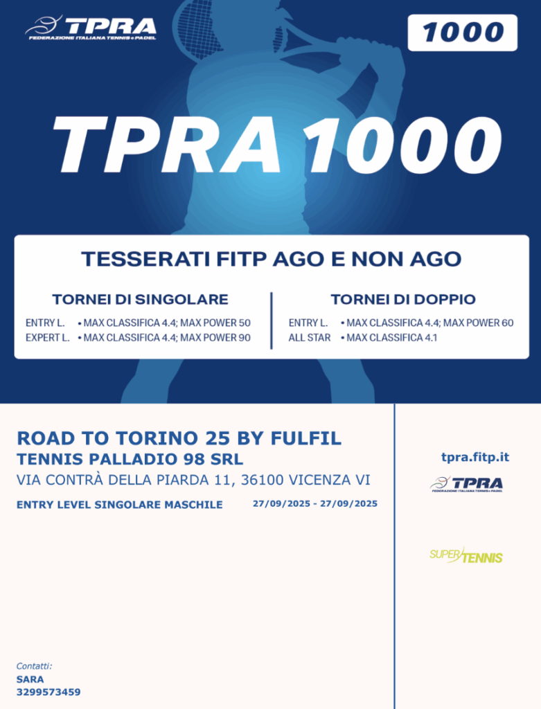 Sabato 27 settembre il Tennis Palladio98 ospiterà i Master TPRA Road To Torino della provincia di Vicenza.