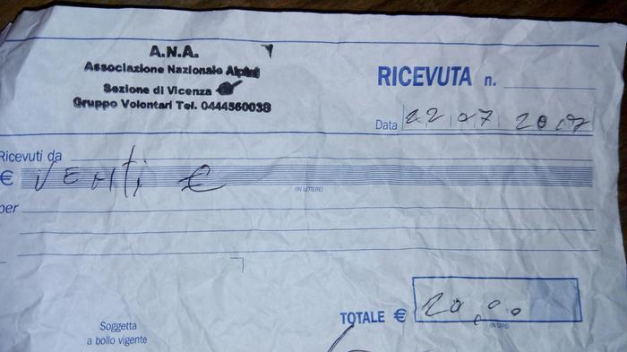 Il numero di telefono (0444 560038) che compare stampigliato nella ricevuta rilasciata a quietanza del ricevimento di 20 euro, datata 22 luglio 2017, non è, e mai lo è stato, nella disponibilità/intestazione della Sezione Ana di Vicenza “Monte Pasubio”.