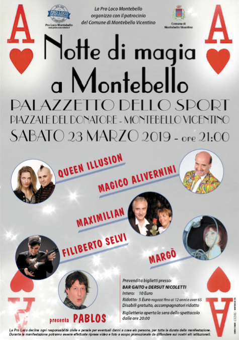 Appuntamento il 23 marzo alle 21 al palazzetto dello sport di Montebello con la magia della… magia! È la terza edizione della “Notte di magia a Montebello”, organizzata dalla Pro Loco con il patrocinio del Comune, che sta riscuotendo sempre più successo e che anche quest’anno proporrà gli spettacoli dei migliori maghi ed illusionisti contemporanei.