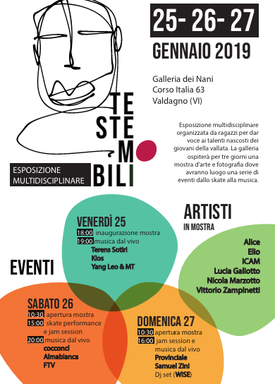 Teste Mobili è un esposizione multidisciplinare nata dall’esigenza di alcuni ragazzi della Valle dell’Agno di un luogo e un momento per esporre arte e musica inedita. La mostra che aprirà oggi, venerdì 25 gennaio alle 18 in Galleria dei Nani a Valdagno, rimarrà aperta fino a domenica sera e includerà pittura, fotografia, esposizioni multimediali e street art.
