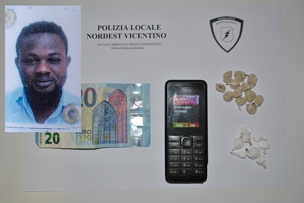 Lo scorso 13 giugno il Rappresentante per la Sicurezza del Quartiere Cà Pajella di Thiene ha comunicato alla Polizia Locale Nordest Vicentino sospetti di spaccio di stupefacenti. In particolare veniva descritto un individuo che, a piedi o in bicicletta, veniva avvicinato nei parcheggi della zona da persone in auto, con veloci passamano. Venivano allora eseguiti accertamenti, che permettevano di appurare almeno 10 cessioni di piccole quantità di sostanze stupefacenti. In data 27 giugno giungeva al comando di polizia locale una mail dal titolo “una mamma preoccupata”, con la quale una signora rappresentava una viva preoccupazione per i propri figli in relazione all’attività dello spacciatore. A quel punto si decideva di intervenire e, alle ore 11:10 di mercoledì 28 giugno, in Piazza Asiago, una pattuglia ha fermato il soggetto in questione, che veniva identificato in IBHAWOH Osesumhen Destiny, 23enne di nazionalità nigeriana, in Italia dall’Agosto del 2015 ed in possesso di Permesso di Soggiorno per Motivi Umanitari. L’uomo veniva quindi accompagnato in comando per procedere alla perquisizione, ma lungo il tragitto tentava di disfarsi di un fazzoletto di carta che teneva nelle parti intime, venendo chiaramente scoperto dagli Agenti. All’interno del fazzoletto erano contenute n. 8 dosi di cocaina e 12 di eroina, del peso complessivo di g. 3,37, che il medesimo avrebbe venduto al costo di € 10,00 l’una. Ne aveva già vendute due. Nel corso dell’operazione il suo telefono cellulare continuava a squillare e, i clienti, tutti italiani, venivano contattati dalla polizia locale confermando di avere acquistato sostanze stupefacenti dal medesimo.