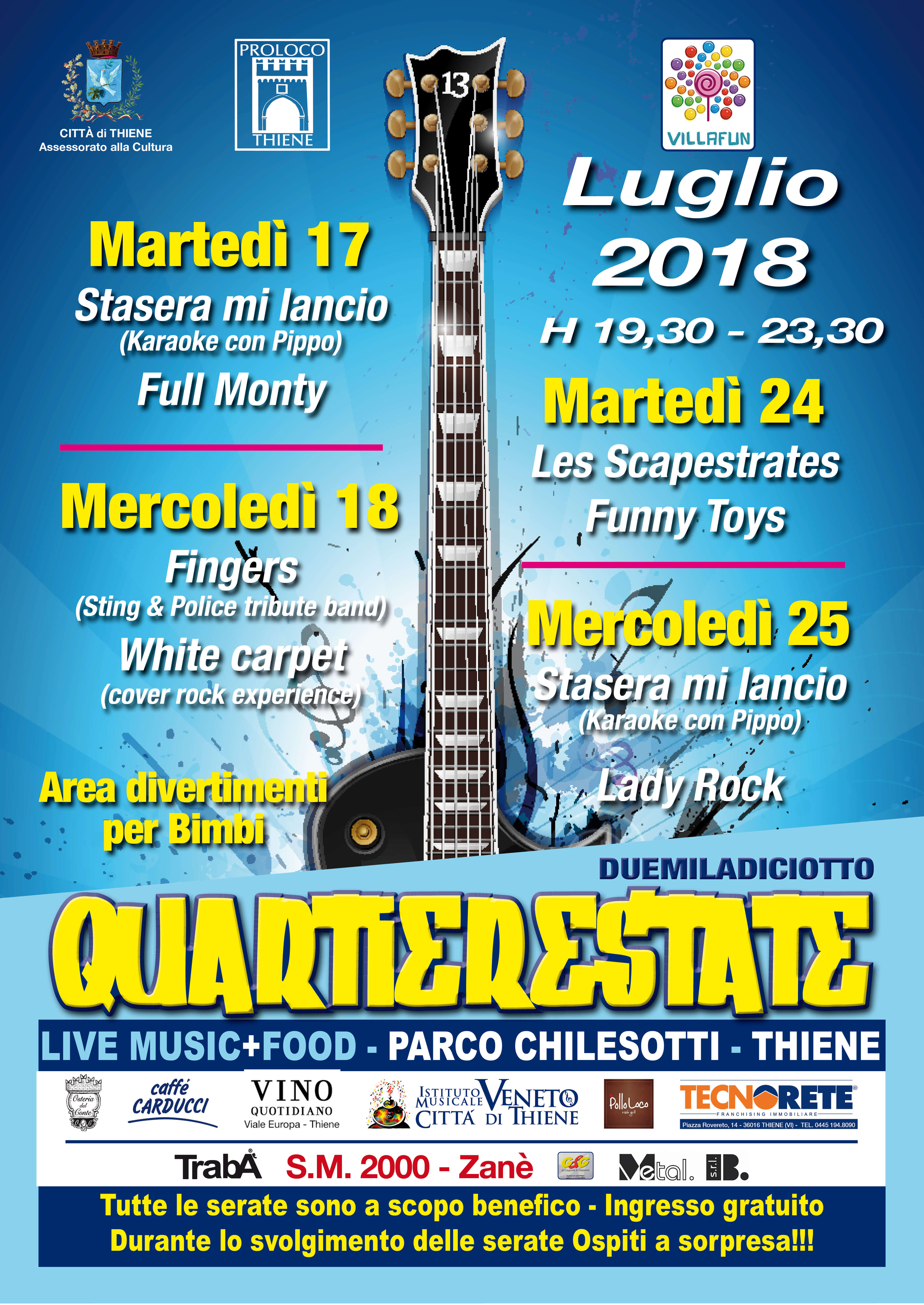 Al via al Parco Chilesotti la quarta edizione di Quartierestate, cartellone di serate live per giovani e famiglie, allestito da giovani thienesi anche con la collaborazione dell’Istituto Musicale Veneto Città di Thiene ed il patrocinio del Comune di Thiene.