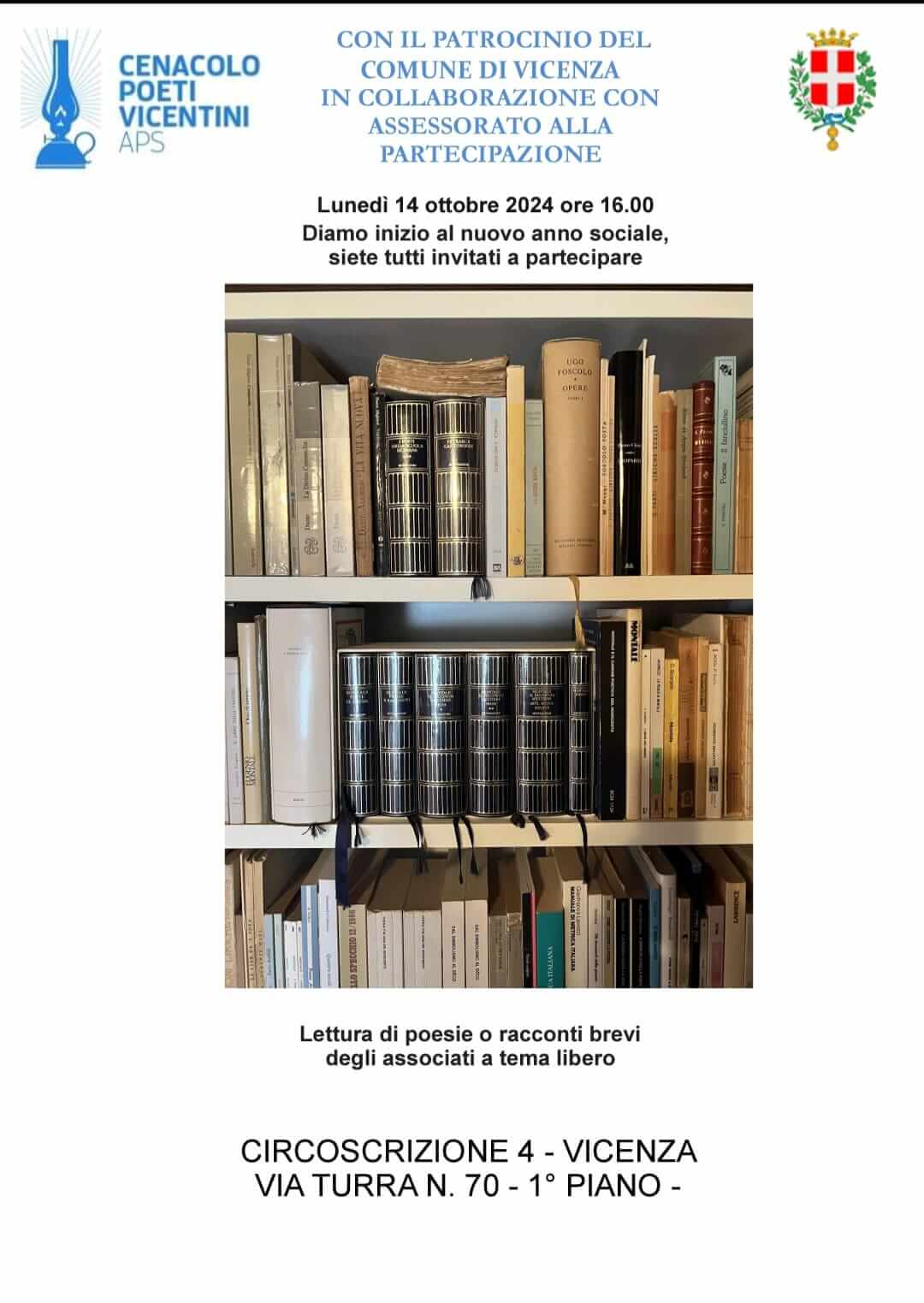 Lunedì 14 ottobre riparte l’attività dei poeti e scrittori del Cenacolo Poeti Vicentini Aps. Con il patrocinio del Comune di Vicenza e in collaborazione con l’Assessorato alla Partecipazione, inizia il nuovo anno sociale, al quale tutta la cittadinanza è invitata a partecipare. Si terranno delle lettura di poesie o racconti brevi a cura degli associati. Il tutto presso la sede presso la Circoscrizione 4 in via Turra 70, 1° piano.