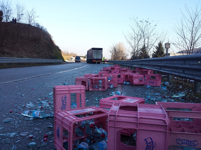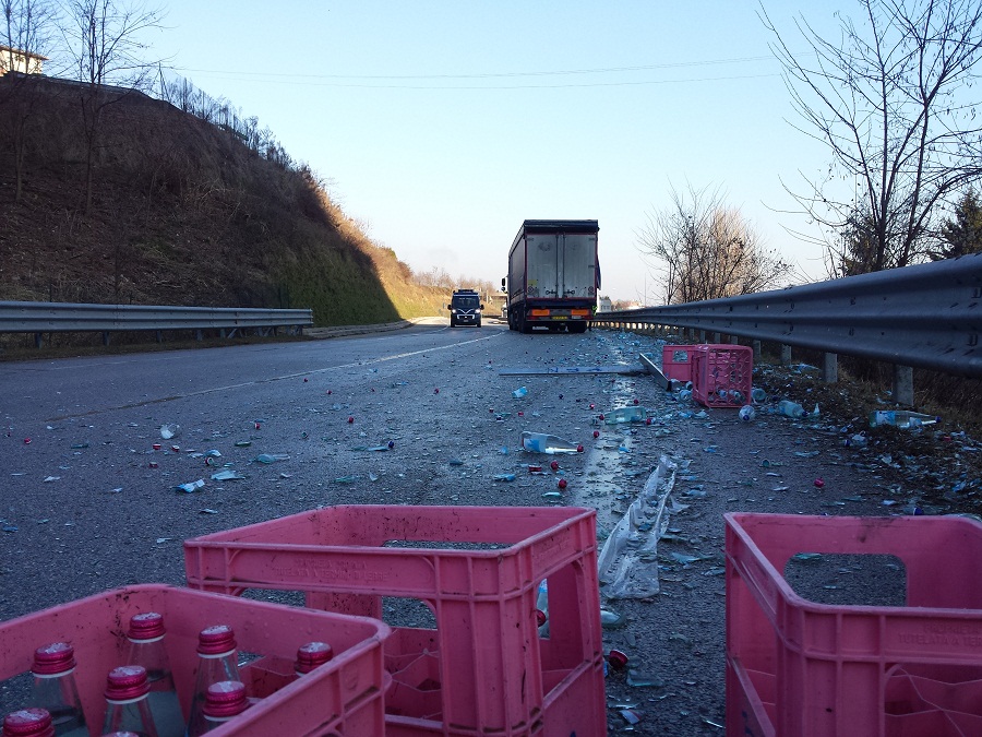 Alle ore 15.00 di mercoledì 25 gennaio 2017 l’autoarticolato DAF condotto dal 48enne rumeno di Verona stava percorrendo la nuova variante della SP 46 nel Comune di Torrebelvicino quando, nell’affrontare una curva a sinistra, a causa della rottura accidentale di una barriera laterale di contenimento del carico, una parte di ques’ultimo composto da 61 casse contenenti bottiglie in vetro d’acqua cadeva sull’asfalto interessando circa 100 metri dell’intera carreggiata. Sul posto intervenivano 2 pattuglie del Consorzio di Polizia Locale Alto Vicentino per deviare il traffico mentre il personale di una ditta privata provvedeva alla rimozione dei cocci di vetro dalla strada. Alle ore 17,40 la strada veniva riaperta al traffico.