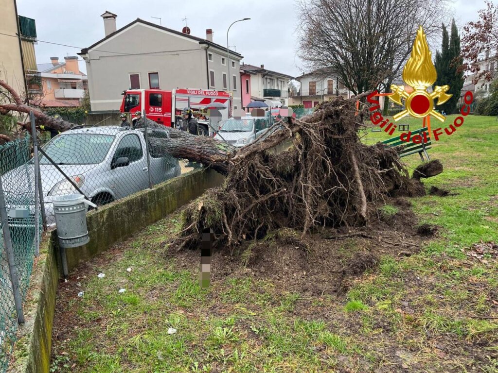 La squadra dei Vigili del fuoco, giunta dalla sede centrale di Vicenza, ha provveduto al taglio e alla rimozione dell’albero, mettendo in sicurezza l’area e liberando il veicolo coinvolto. Oltre all’auto, la caduta del pino ha causato danni anche alla recinzione di un parco pubblico comunale.