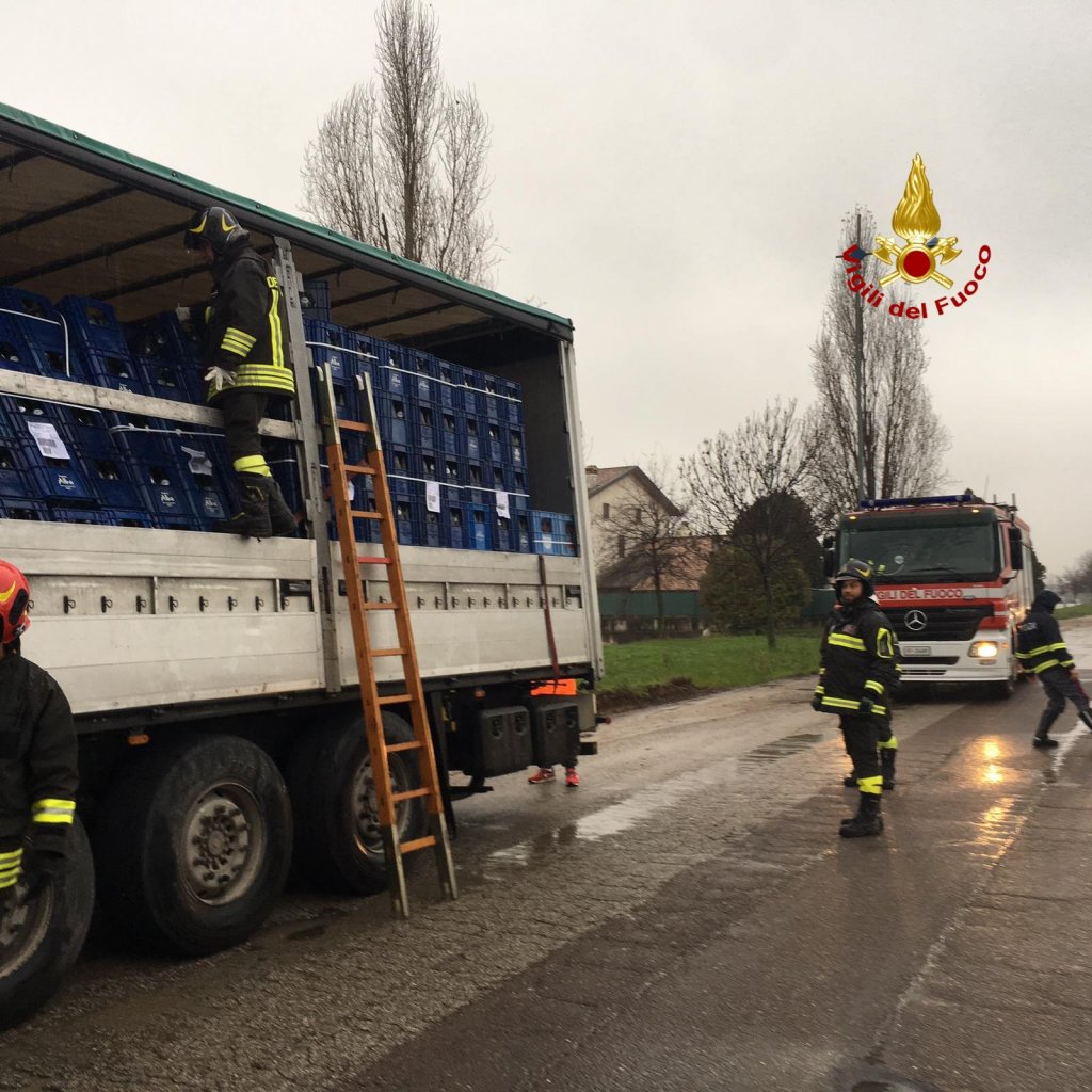 Nel primo pomeriggio, i vigili del fuoco sono intervenuti un chilometro prima dell’ingresso del casello autostradale di Thiene per il carico pericolante di un autoarticolato. L’autista del mezzo si è accorto dopo aver affrontato una rotatoria dello spostamento dei bancali carichi di acqua, finiti contro la centinatura del rimorchio. La squadra dei pompieri arrivati da Schio, hanno provveduto a spostare manualmente il carico più precario, che è stato caricato su un altro camion. Il carico in procinto di cadere è stato tenuto in equilibrio da un mezzo di cantiere fatto arrivare da una vicina officina. Le operazioni di messa in sicurezza dei 300 quintali di bancali d’acqua da parte dei vigili del fuoco sono terminate dopo circa due ore.
