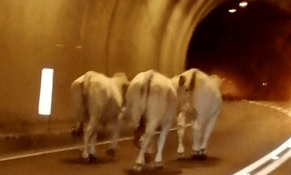 Tre mucche a spasso in galleria, incuranti dei rischi per loro e per gli automobilisti. E’ successo la scorsa notte agli automobilisti in transito a Schio, nel tunnel prima del traforo che porta a Valdagno. A darne resoconto con tanto di foto il gruppo Facebook “Sei di Schio se…”: l’avvistamento ha fatto subito il giro del web, con relativi commenti e like. I Carabinieri, prontamente avvisati, sono riusciti a risalire all’ignaro malgaro e le tre mucche sono state riportate in stalla.