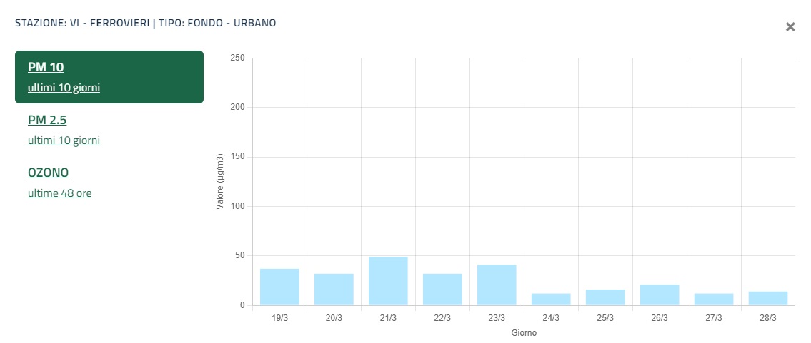 Negli anni scorsi siamo stati abituati a primavere poco piovose ma il 2024, se da un lato porta tanta acqua creando non pochi disagi, dall’altro ci permette di respirare aria migliore. Nel mese di marzo non è mai stato superato il limite in base ai dati della centralina dei ferrovieri. La situazione di ieri nella tabella sopra, che indica che l’aria si mantiene costantemente sotto il livello di 50 µg/m3 di Pm10. Il minimo è stato raggiunto il 24 marzo con 12 µg/m3 mentre ieri il dato indicava 14 µg/m3