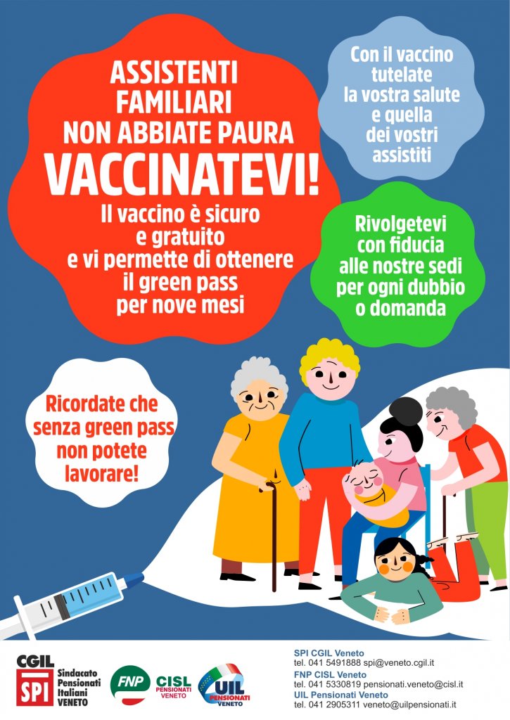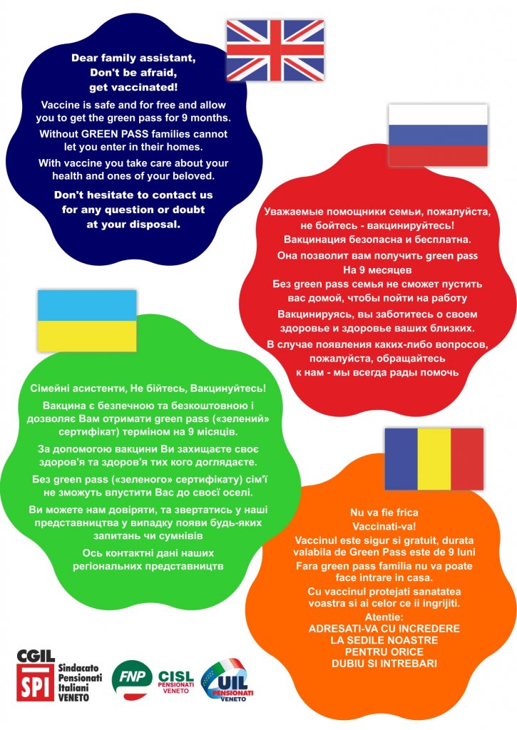 Un appello a vaccinarsi tradotto in inglese, rumeno/moldavo, russo e ucraino. È questa l’iniziativa con cui i sindacati dei pensionati di Spi Cgil, Fnp Cisl e Uilp Uil del Veneto si rivolgono alle tantissime assistenti familiari che nella nostra regione accudiscono anziani non autosufficienti. Il problema è noto e preoccupante: moltissime badanti, provenienti soprattutto dall’Est Europa, non sono vaccinate o lo sono, ma con sieri non riconosciuti da nessuna agenzia del farmaco. Adesso potrebbero comunque fare la terza dose.
