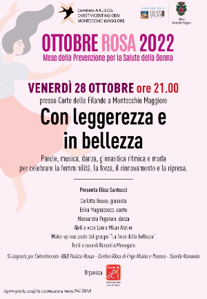 A Montecchio Maggiore, invece, venerdì 28 ottobre è in programma una grande serata in parole, musica, danza, ginnastica ritmica e moda per celebrare la femminilità, la forza, il rinnovamento e la ripresa. Tutto questo è “Con leggerezza e in bellezza”, iniziativa promossa dall’associazione culturale L’IdeAzione in collaborazione con la Città di Montecchio Maggiore.