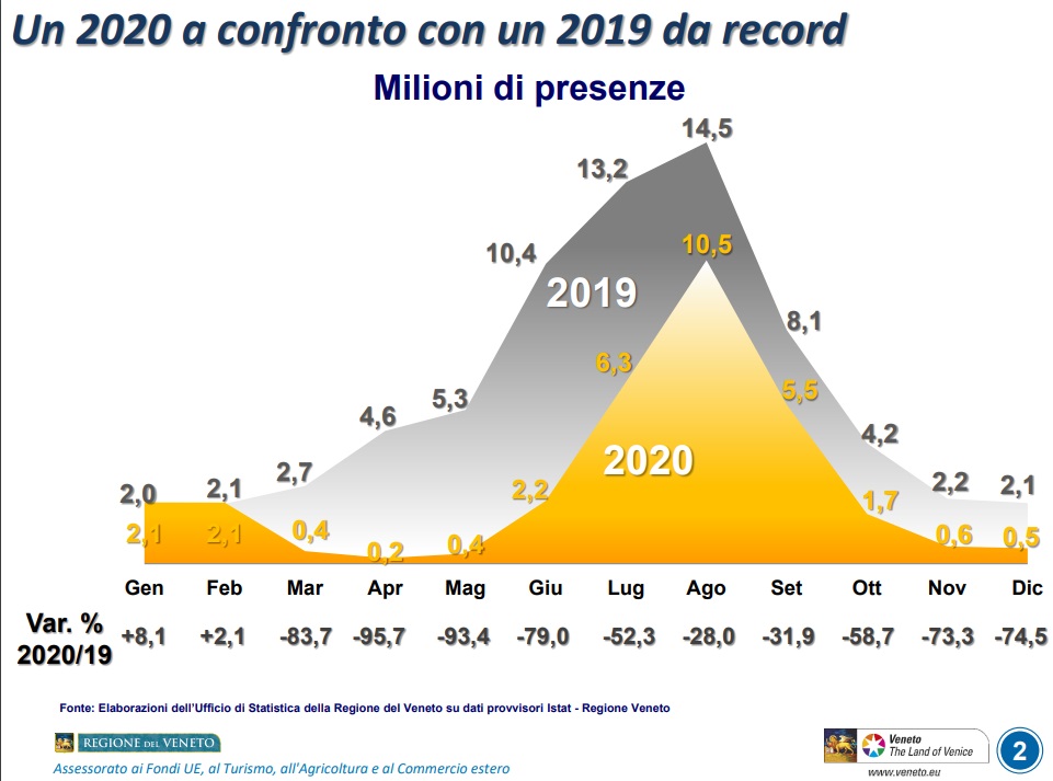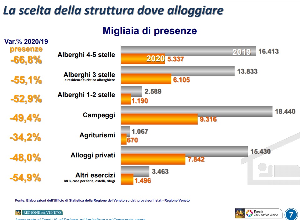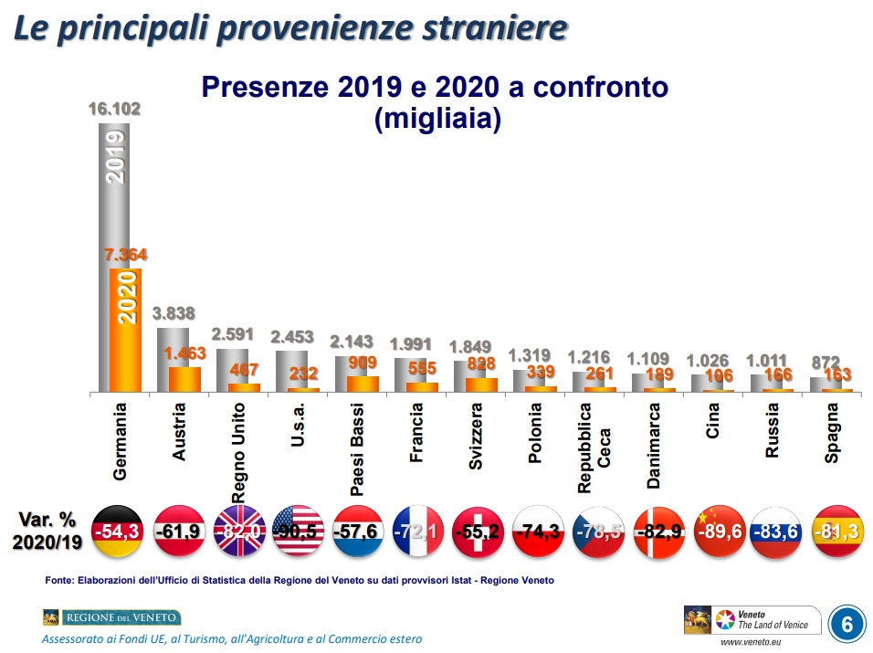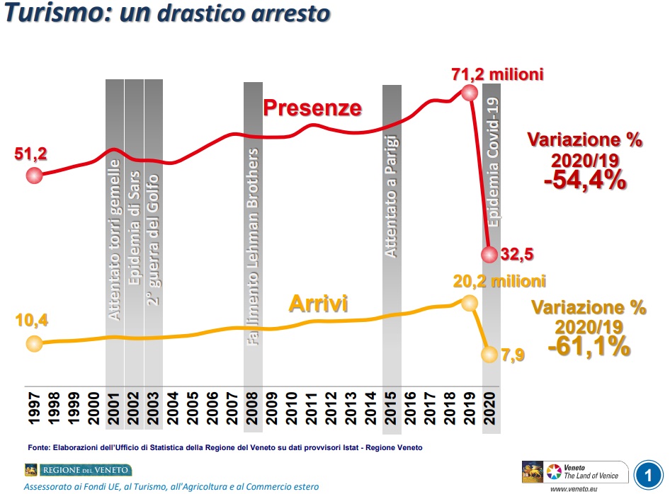 Dagli attentati terroristici alle guerre, dalle tensioni politiche internazionali alle profonde crisi economiche: mai fattori destabilizzanti di rilievo planetario avevano messo in crisi l’economia delle vacanze e dei viaggi come la pandemia da Covid. Dopo i record raggiunti dal turismo veneto negli anni precedenti, il 2020 si è chiuso con un – 61,1% degli arrivi e un – 54,4% delle presenze. Ciò è dovuto soprattutto alla forte riduzione di turisti stranieri, che nel 2019 rappresentavano il 65,3% dei visitatori,