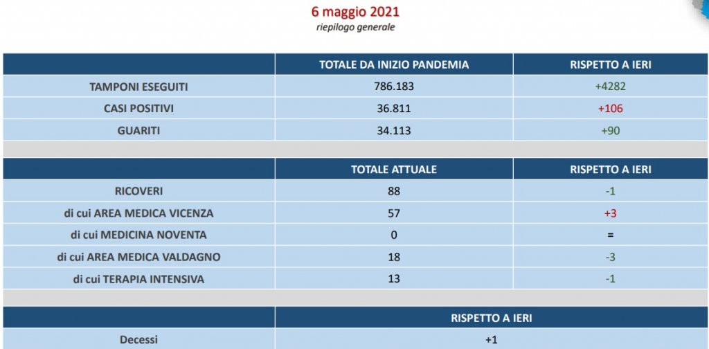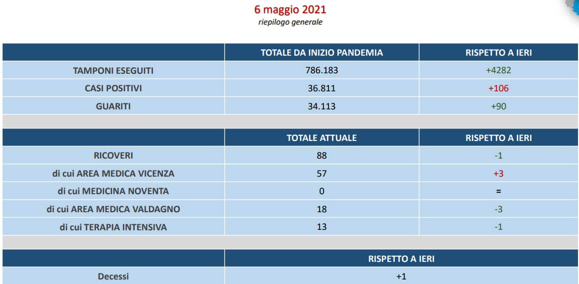Nelle ultime 24 ore si sono registrati 106 contagi su 4282 tamponi eseguiti ed un decesso.