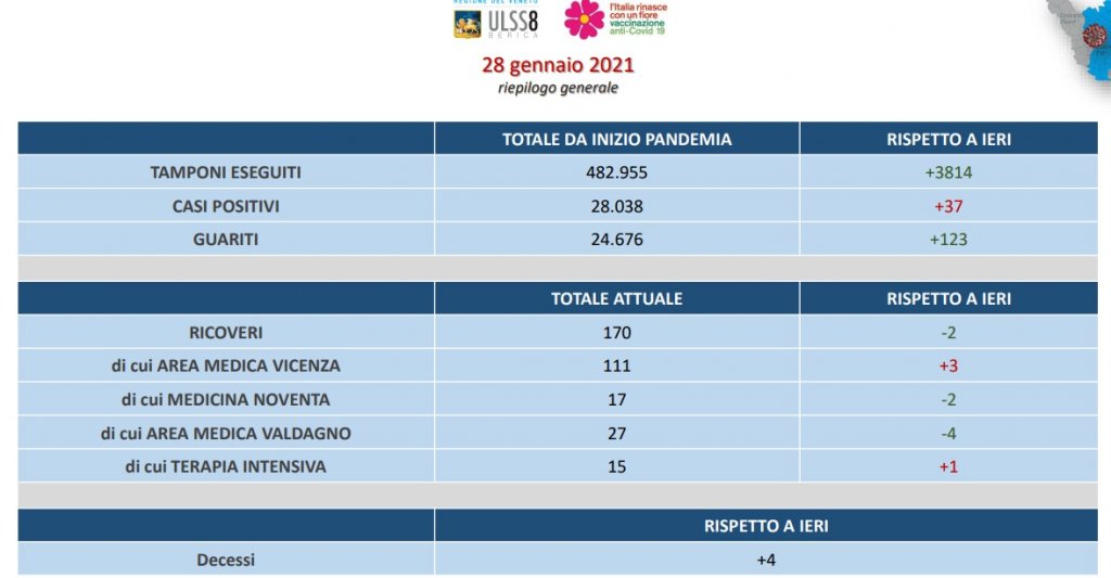 Ulss 8 Berica – 37 positivi su 3814 tamponi – In calo ricoveri – 4 decessi