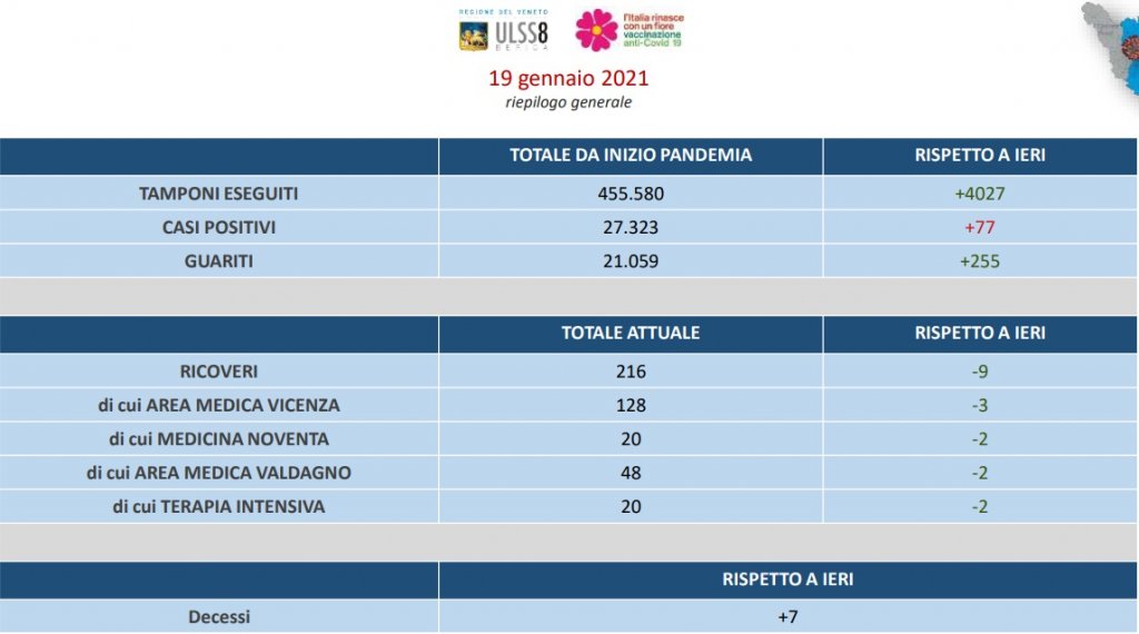 ULSS 8 BERICA – Altri 7 morti: diminuiscono i contagi e calano i ricoveri
