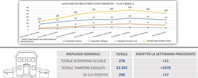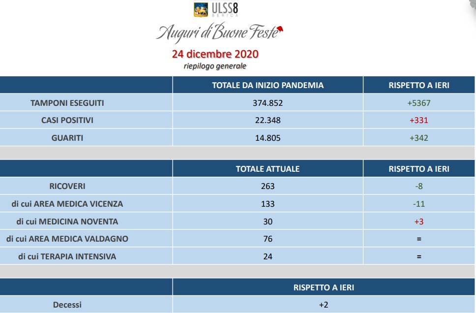 Nell’ Ulss 8 Berica prosegue la tendenza decrescente della curva dei ricoveri come già notato nelle altre giornate di questa ultima settimana. Il numero delle persone guarite si conferma superiore rispetto al numero dei casi positivi e le terapie intensive rimangono stabili.