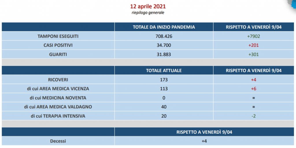 Nel weekend pasquale erano stati rilevati 282 positivi e i ricoveri erano aumentati di 14 unità (arrivando a 180 nell’Ulss 8). Attualmente i ricoverati sono 173 (+4) rispetto a venerdì. Le terapie intensive calano di 2 unità. I decessi sono 4. Nel weekend pasquale furono 10.