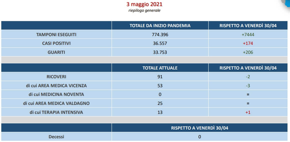 Nessun decesso nel weekend nell’Ulss 8 Berica. A fronte di 7444 tamponi sono stati rilevati 174 positivi, mentre i guariti sono 206. In calo i ricoveri (-2). Un paziente in più in terapia intensiva. Sotto: il bollettino di oggi e a seguire quello di lunedì scorso. In una settimana i ricoveri sono passati da 113 a 91 (-22). Le terapie intensive da 15 a 13