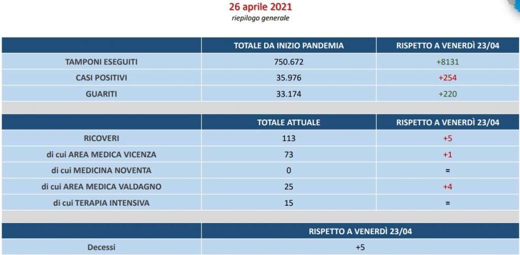 Ulss 8 Berica – Nel weekend 7500 tamponi e 174 positivi: in calo ricoveri – Il confronto con lunedì scorso