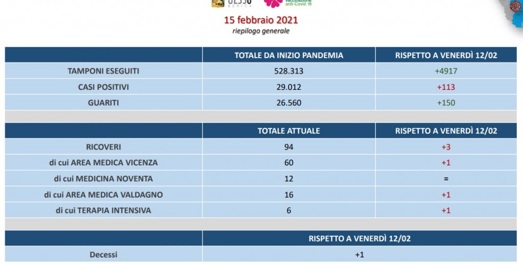 Nei dati del bollettino dell’Ulss 8 Berica emerge dopo qualche settimana una controtendenza per quanto riguarda i ricoveri (+3). Un solo decesso da venerdì mentre i guariti (150) superano i nuovi contagiati (113)