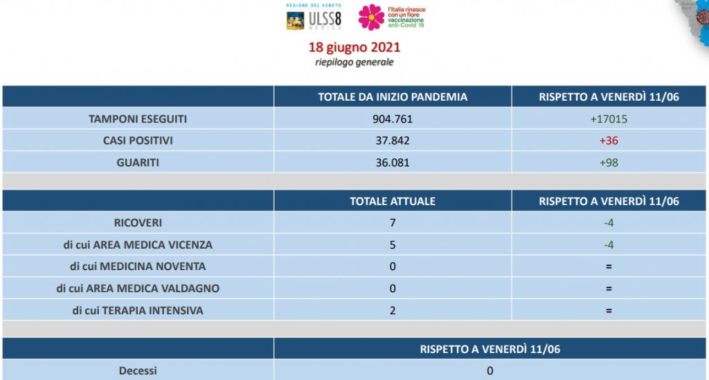 Scende la curva del contagio nell’Ulss 8 Berica. In base al bollettino settimanale, rispetto a venerdì scorso i nuovi contagiati sono 36 su 17.015 tamponi eseguiti. I ricoverati sono 7 (-1) di cui 2 in terapia intensiva.