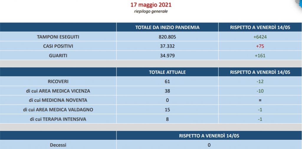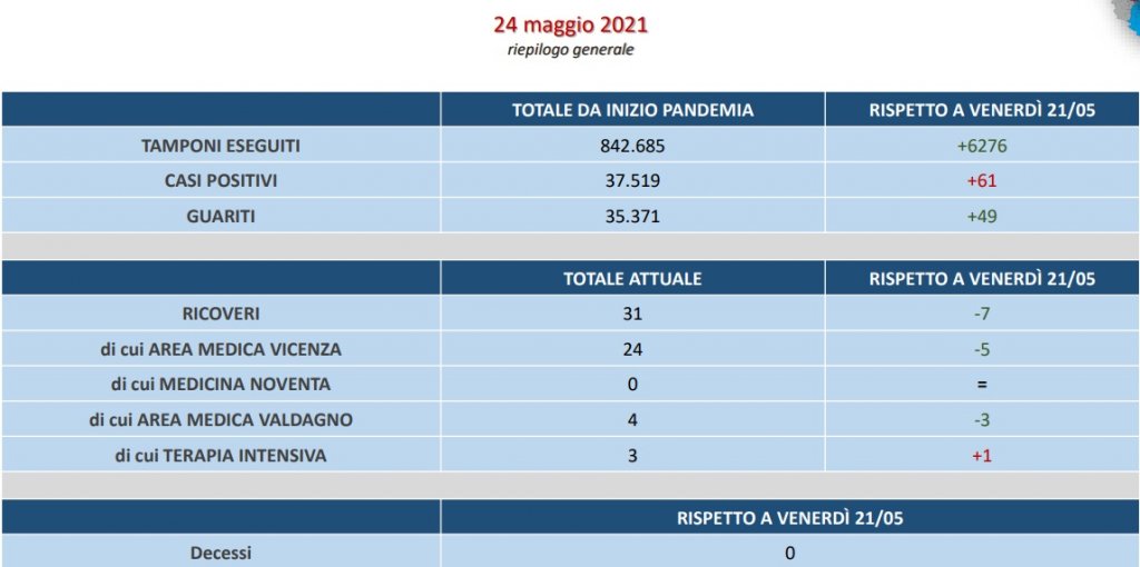 Continua la decrescita della curva del contagio, dei decessi e dei ricoveri nell’Ulss 8 Berica. Nel bollettino di oggi (lunedì 24 maggio), rispetto a venerdì, sono stati rilevati 61 nuovi casi su quasi 6300 tamponi.