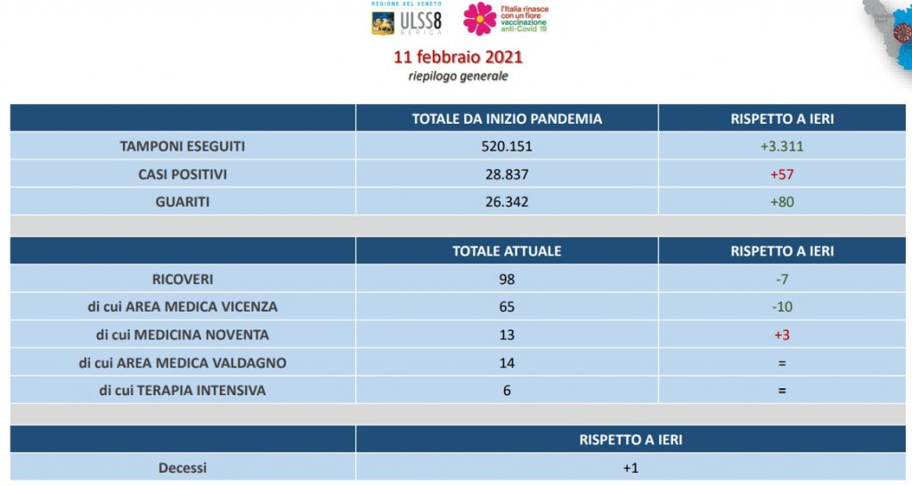 Ancora segnali positivi per l’Ulss 8 Berica, in attesa dei dati dei prossimi giorni e dell’effetto che potrebbe avere la zona gialla sui contagi.