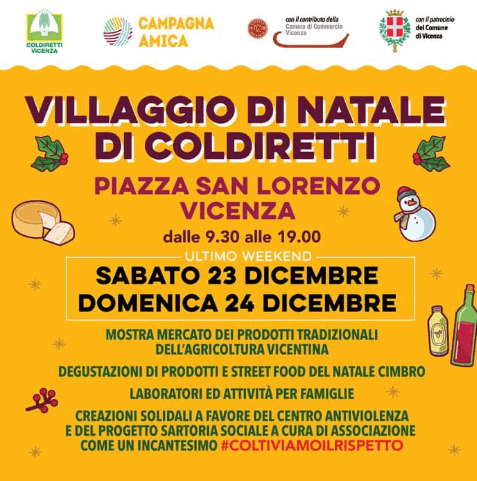 Fino al 24 dicembre, al mercato coperto di Campagna Amica Vicenza, dalle 9.30 alle 19 sarà possibile trascorrere dei piacevoli momenti al Villaggio di Natale di Coldiretti, allestito per l’occasione in Piazza San Lorenzo, con la mostra mercato dei prodotti tradizionali dell’agricoltura vicentina, degustazioni di prodotti e street food di Natale cimbro, laboratori ed attività per le famiglie, nonché creazioni solidali a favore del Centro antiviolenza e del progetto Sartoria sociale a cura dell’Associazione come un incantesimo.